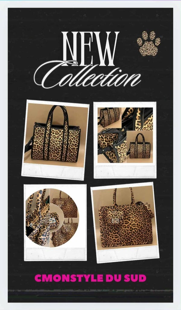 Sac imprimé léopard 🐆 noir, en matières simili cuir, fermeture zip ,porter à la main ou en bandoulière. Poches intérieure.