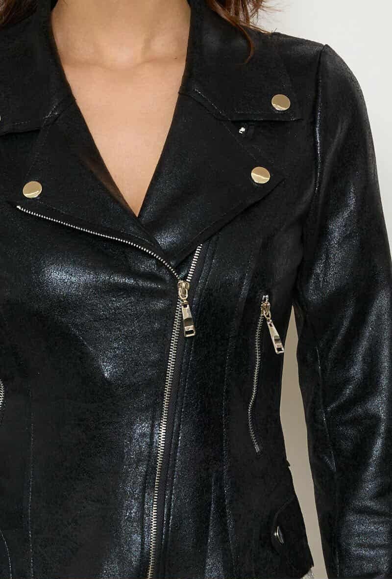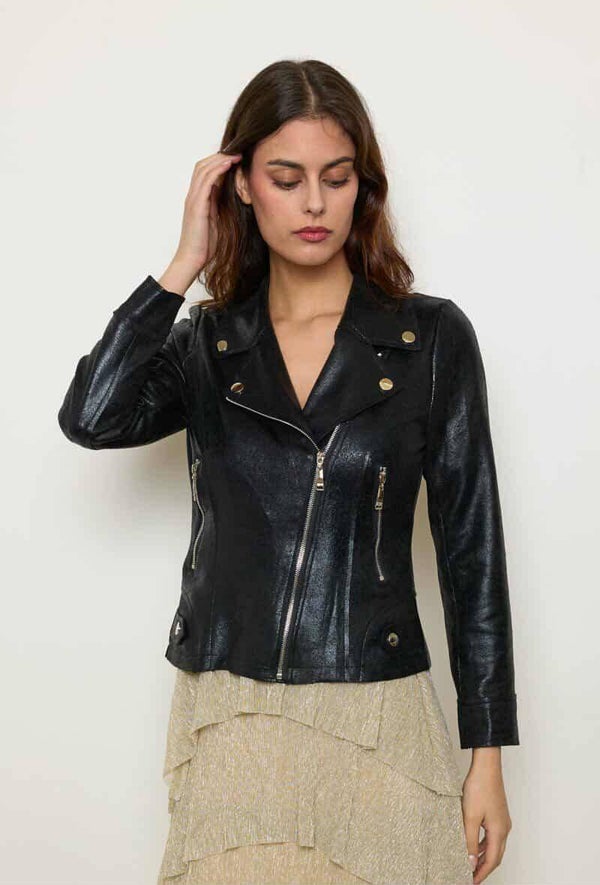 Veste Perfecto simili cuir irisé toucher croûte de cuir, Élasthanne très stylé, 2 poches zip argenté.