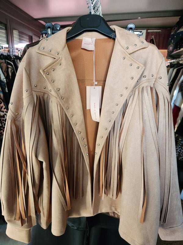 Veste à frange clouté suédine, très tendance en 2025/2026 disponible en camel claire.