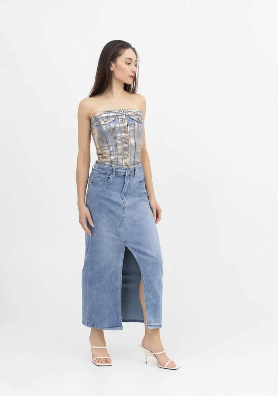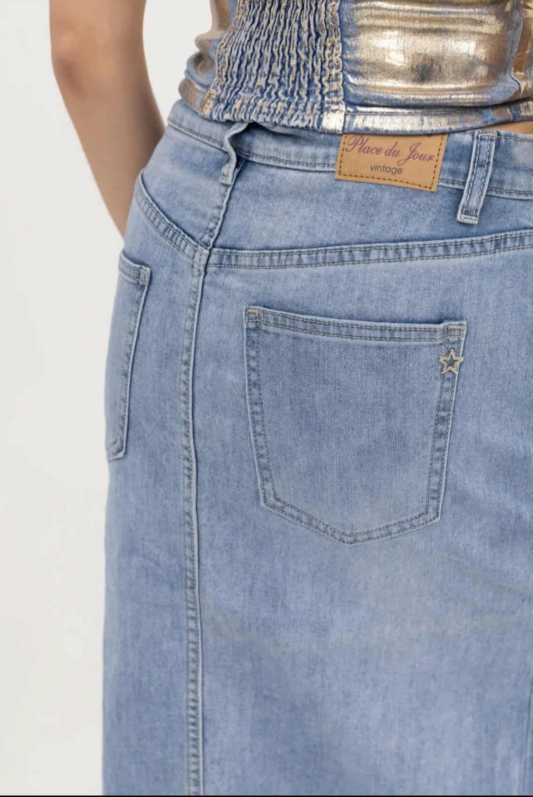 Jupe en jean bleu avec irisé doré, de la marque place du jour.