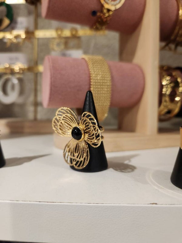 Bague fleur relief pierre noir en acier inoxydable réglable et ajustable.