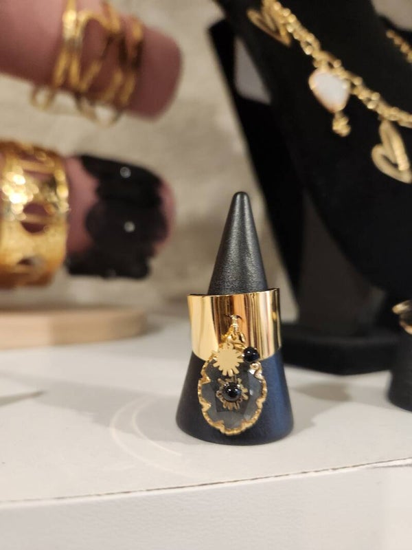 Bague pampille fleur pierre noir en acier inoxydable réglable et ajustable.